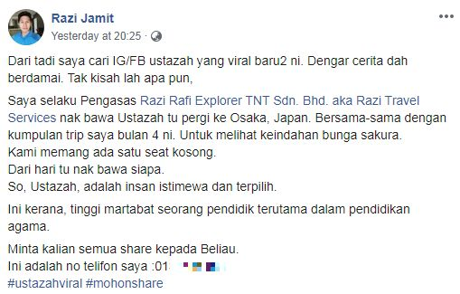 Menerusi laman Facebook, lelaki bernama Razi Jamit itu menguar-uarkan hasratnya yang mahu menghadiahkan guru agama tersebut pakej pelancongan selama lima hari ke Osaka, Jepun pada April depan.