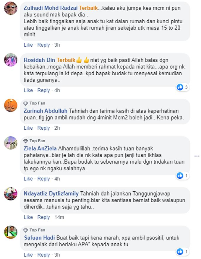 "Terima kasih kerana prihatin, biarkan apa bapa dia nak cakap, janji anak dia selamat," tulis seorang pengguna Facebook.