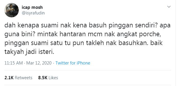 “Dah kenapa suami nak kena basuh pinggan sendiri? Apa guna bini? Mintak hantaran macam nak angkat Porsche, pinggan suami satu tu pun takleh nak basuhkan. Baik takyah jadi isteri,” tulis pelayar tersebut.