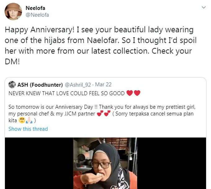 “Happy Anniversary! I see your beautiful lady wearing one of the hijabs from Naelofar. So I thought I’d spoil her with more from our latest collection. Check your DM! (Selamat ulang tahun! Saya nampak isteri awak yang cantik memakai salah satu tudung daripada Naelofar. Jadi, saya fikir nak manjakan dia dengan koleksi terbaharu kami. Tengok DM!),” kata Neelofa.