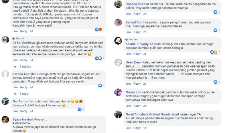 “Entah berapa banyak tangisan anak ini atas pengorbanan ayah dan ibu mereka yang bergelar frontliner. Kita yang masih sihat dan diberi rehat kat rumah tolonglah faham dan ambil peduli. Patuhilah arahan kerajaan,” tulis seorang pelayar.