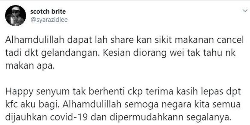 Happy senyum tak berhenti ckp terima kasih lepas dpt kfc aku bagi. Alhamdulillah semoga negara kita semua dijauhkan covid-19 dan dipermudahkann segalanya. pic.twitter.com/FJfFqa9rvD