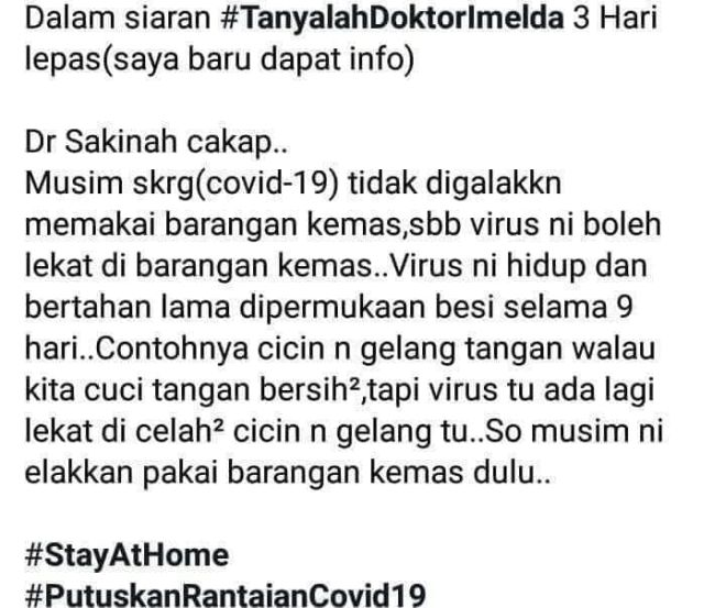 KECOH di media sosial apabila orang ramai tidak digalakkan memakai barang kemas ketika krisis Covid-19, kononnya virus tersebut boleh melekat pada permukaan besi selama sembilan hari.