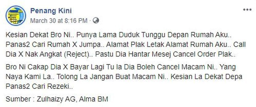 "Rider tu bagitahu saya, pelanggan ni belum bayar. Sebab tu dia boleh batal ikut suka hati sahaja.