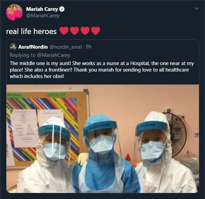 "Saya memang selalu reply tweet Mariah, tapi tak pernah dapat respons. Kemudian dia ada tweet pasal frontliners, jadi saya reply lagi dengan gambar ibu saudara dan rakan jururawatnya.