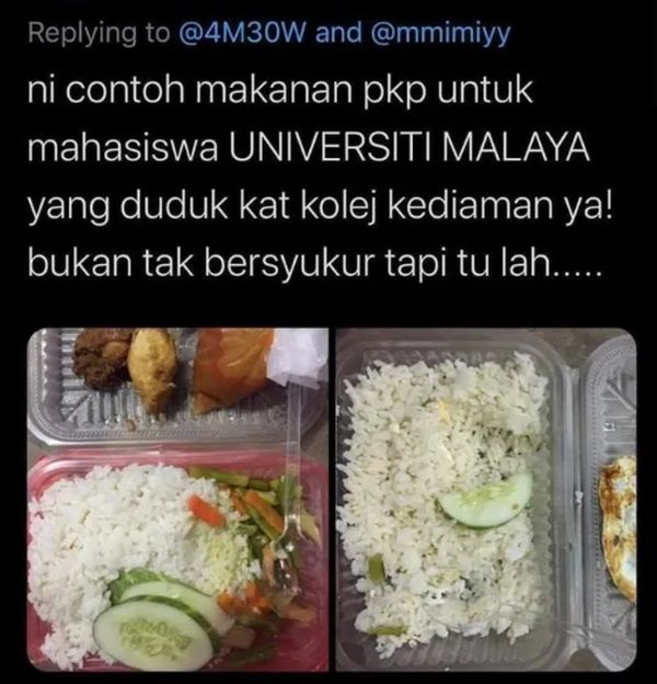 Bersama-sama posting tersebut, pelajar berkenaan menulis: “Ini contoh makanan untuk mahasiswa Universiti Malaya yang duduk dekat kolej kediaman ya. Bukan tak bersyukur tapi tu lah….”