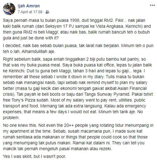 Terpanggil untuk berkongsi pengalaman, seorang pelayar Facebook yang juga bekas mahasiswi di IPTA berkenaan, Ijah Amran menceritakan dia pernah mempunyai hanya RM2 dalam dompet untuk bertahan sehingga gaji bulan seterusnya masuk.
