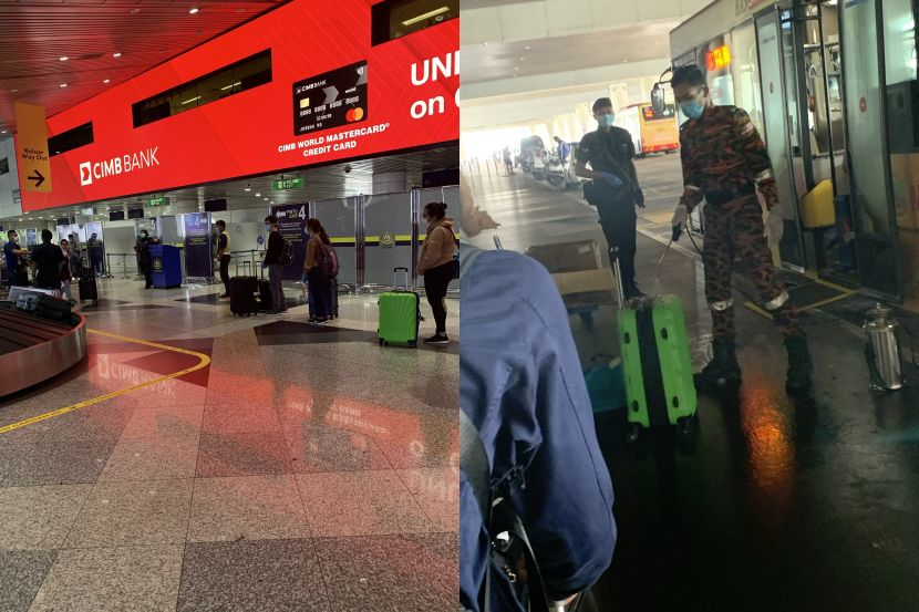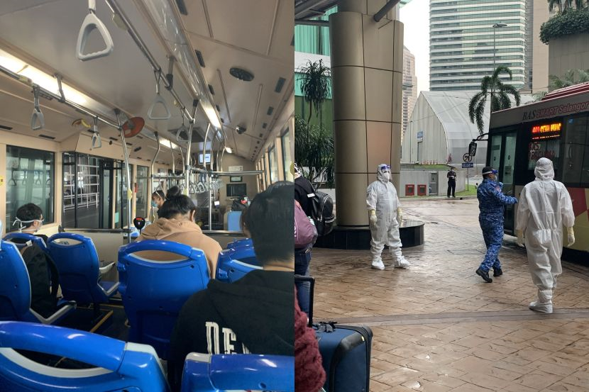 "Selepas itu kami dibawa menaiki sebuah bas menuju ke balai ketibaan. Setiap bas membawa maksimum 10 penumpang dan kerusi ditanda dengan X supaya kami duduk jauh antara satu sama lain.