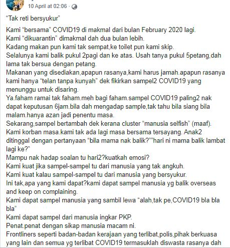 “Frontliners seperti badan-badan kerajaan yang terlibat, polis, pihak berkuasa yang lain dan semua yang terlibat Covid-19 termasuklah di swasta rasanya dah habis ikhlas dah buat kerja demi negara. Cuma dek kerana manusia ‘eh duk sini memang macam hotel tapi makanan out’… kami letih!