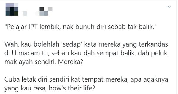 "Pelajar IPT lembik, nak bunuh diri sebab tak balik. Wah, kau bolehlah 'sedap' kata mereka yang terkandas di U macam tu, sebab kau dah sempat balik, dah peluk mak ayah sendiri. Mereka? Cuba letak diri sendiri kat tempat mereka, apa agaknya yang kau rasa, how's their life?” begitulah tulis pelayar tersebut dalam perkongsian pandangannya menerusi satu thread (bebenang).