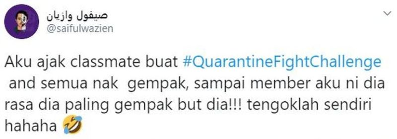 Aku ajak classmate buat #QuarantineFightChallenge and semua nak gempak, sampai member aku ni dia rasa dia paling gempak but dia!!! tengoklah sendiri hahaha ? pic.twitter.com/4o5AAhAQti