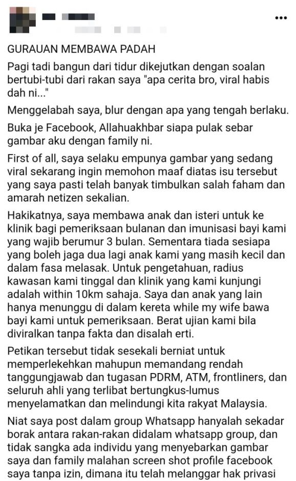 Terdahulu, dilaporkan bahawa polis telah mengenal pasti individu yang memuat naik satu posting yang tular di media sosial sejak Khamis mendakwa mereka sekeluarga berjaya melepasi sekatan jalan raya semasa PKP.