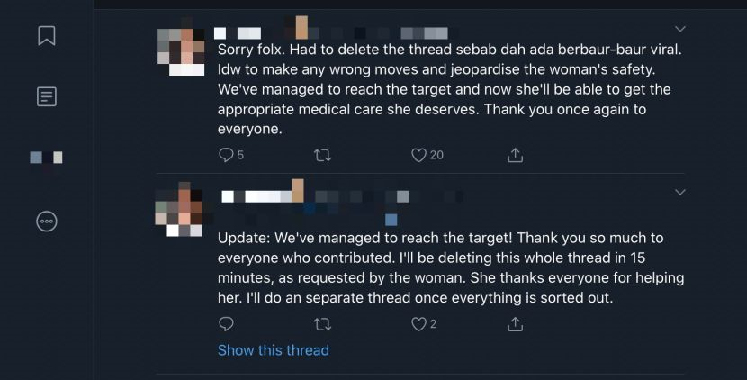 "Tak sempat usha tweet tu, nak gugurkan baby satu hal minta duit orang, satu hal lagi kalau benda tu menipu je. Orang buta buta kasi duit, dia delete thread, duit entah kemana, yang nak gugur entah betul ke tidak.