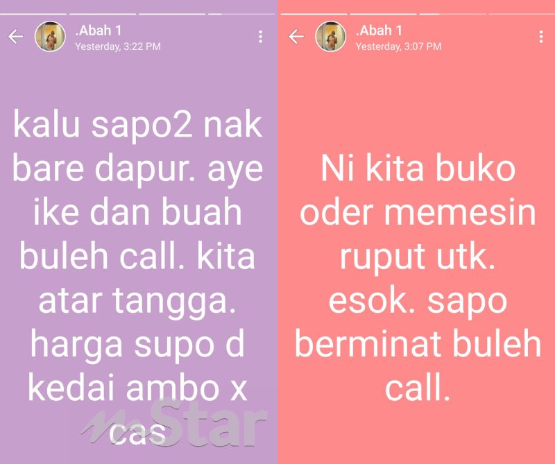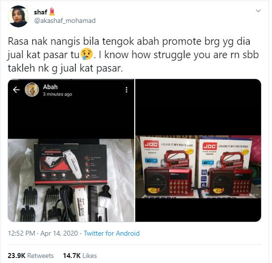 “Jadi ketika ini kerajaan sedang kuatkuasakan PKP, abah tak dapat berniaga seperti biasa. Suatu hari tu saya perasan abah iklankan barang-barangnya di Whatsapp Story dan ada juga dia kongsi di Group Whatsapp.