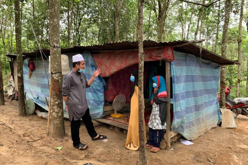 Ustaz Ebit Lew memberi bantuan kepada sebuah keluarga kurang berkemampuan yang hanya menumpang teduh di sebuah pondok di dalam kebun getah. Foto: FB Ebit Lew