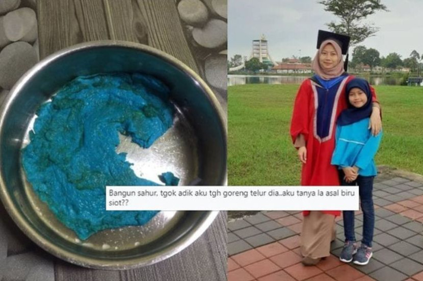 Begitulah ungkapan seorang kakak, Eryna Zamri, yang terkejut apabila melihat adiknya sedang menggoreng telur dadar berwarna biru.