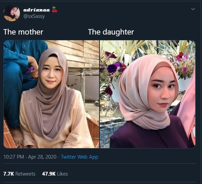 WAJAH jelita yang dimiliki gadis ini pastinya diwarisi daripada ibunya. Malah, perkongsian foto perbandingan wajah mereka berdua cukup mencuri perhatian sehingga ia menjadi tular di Twitter. Menurut Adriana Afrina, 17, dia sekadar berkongsi foto itu secara suka-suka dan cukup terkejut dengan reaksi yang diterima. ARTIKEL BERKAITAN: TikTok punya hal, ibu 5 anak tiba-tiba popular... tanpa bantuan filter kamera - “Mami pun tak ada rutin atau tip pelik-pelik” ARTIKEL BERKAITAN: Wow, anak dah 4 tapi 'maintain' cun, aunty awet muda sikit pun tak lokek kongsi petua! "Sebenarnya benda ni terfikir masa saya tengah scroll galeri dan terjumpa gambar favourite mak saya masa raya tahun lepas. "Saya post sebab dulu ada juga orang buat macam tu. Jadi kenapa tidak untuk saya buat secara suka-suka? Adriana terkejut foto ibunya menjadi tular di laman Twitter. "Tak jangka pun ia akan viral, kemudiannya esok tu saya bangun terus terkejut tengok notification banyak masuk," ujar Adriana kepada mStar. Menurut gadis itu, ibunya yang dikenali sebagai Jamilah kini berusia 45 tahun. Ada juga yang DM (direct message) tanya rahsia, tapi mak saya tak ada amalkan apa-apa pun. Cuma pakai sabun beras sahaja. ADRIANA AFRINA ANAK Malah, belum sempat dia bercerita mengenai posting tular itu, ibunya terlebih dahulu tahu setelah diceritakan oleh rakan-rakan serta sepupu Adriana. "Mak saya tahu bukan dari saya. Sepupu saya dan kawan-kawan dia yang beritahu. Saya nak cakap tapi mereka lagi laju. "Ada juga yang DM (direct message) tanya rahsia, tapi mak saya tak ada amalkan apa-apa pun. Cuma pakai sabun beras sahaja," kongsi Adriana. Lagi foto ibunya yang dikongsi di Twitter. Kata gadis itu lagi, dia sama sekali tidak kisah apabila dibandingkan dengan ibunya. Malah, anak kelahiran Selangor itu turut mengakui bahawa ibunya kelihatan cukup menawan dan menarik menerusi posting yang dikongsinya di Twitter. Sehingga kini, posting tersebut menerima lebih 7,700 ulang kicau (Retweet) di laman Twitter. Antara komen-komen netizen. Malah, ia turut dihujani pelbagai komen netizen yang rata-ratanya memuji kecantikan dua beranak itu. "Saya dapat lihat dari mana awak mewarisi gen kecantikan. "Kakak dengan adik ke? Posting asal yang dikongsikan di Twitter. "Hai masih single? Hahaha gurau-gurau. By the way mak awak memang cantik. "MasyaAllah dua-dua lawa," tulis beberapa netizen. Menerusi laporan mStar baru-baru ini, seorang wanita berusia 41 tahun turut menjadi tular setelah fotonya dikongsi di laman Twitter. Biarpun sudah memiliki empat cahaya mata, kisah kecantikan dan awet muda Rahayu Razali berjaya mencuri tumpuan ramai. Nak macam-macam info? Join grup Telegram mStar!