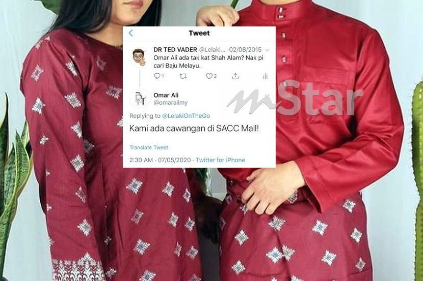 "Omar Ali ada tak kat Shah Alam? Nak pergi cari baju Melayu," dia bertanya menerusi tweet yang bertarikh 2 Ogos 2015.