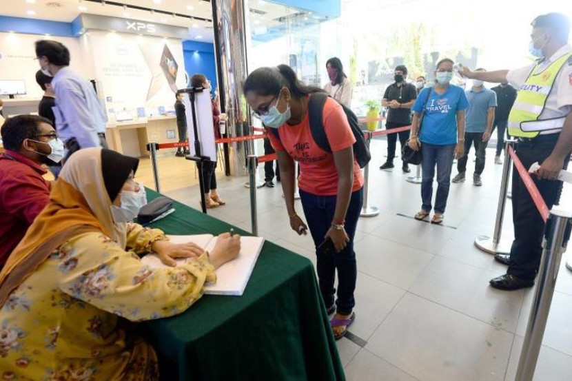 Selain mendaftar nama dan nombor telefon, pengunjung juga perlu diperiksa suhu badan. Foto Bernama
