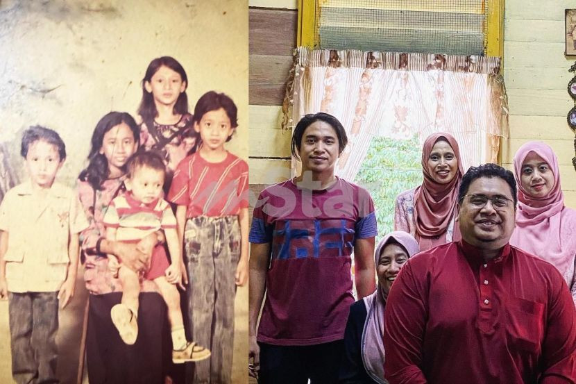 Gambar kiri menunjukkan Hafiz bersama adik-beradiknya 26 tahun lalu dan gambar kanan dirakamkan pada minggu pertama Aidilfitri.