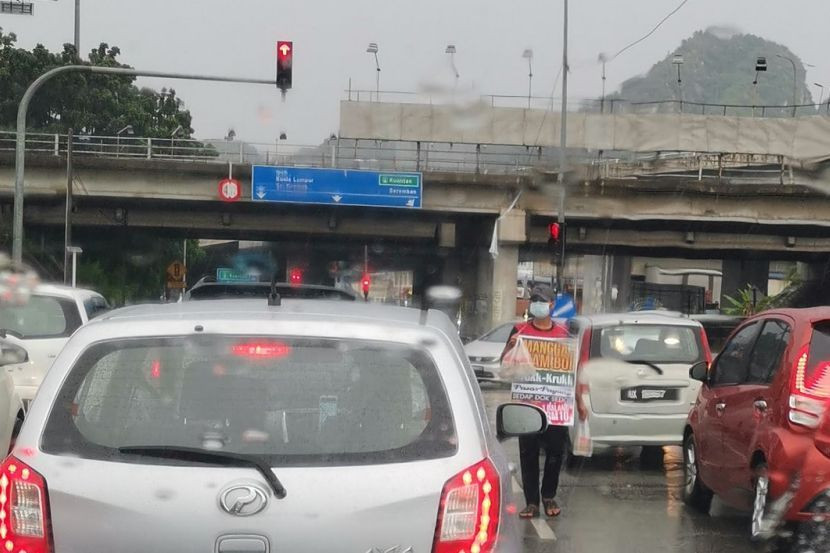 Seorang anak muda menjual mangga asam boi di persimpan lampu isyarat dekat Gombak, Selangor. Foto Facebook Mohd Fadli Salleh