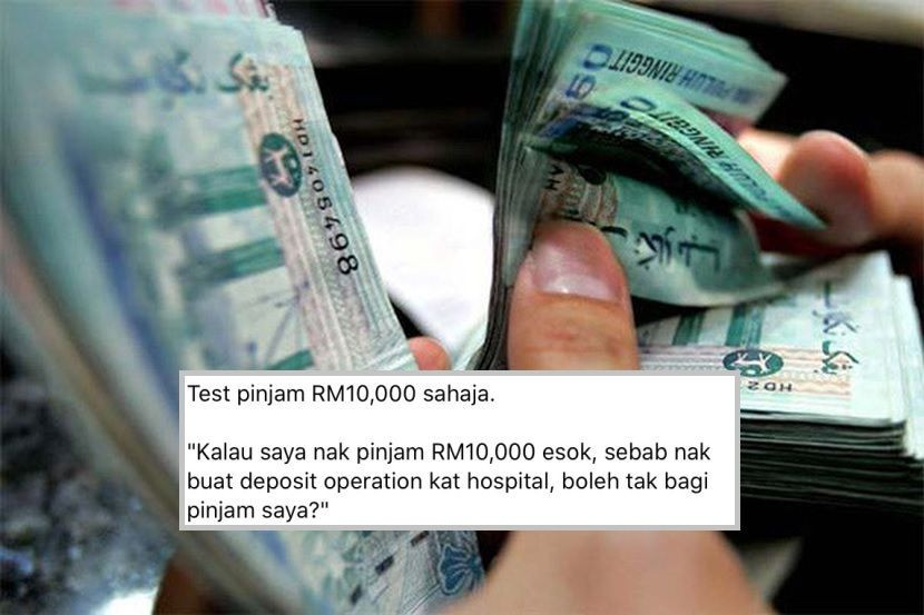 "Test pinjam RM10,000 sahaja. Kalau saya nak pinjam RM10,000 esok sebab nak buat deposit operation kat hospital, boleh tak bagi pinjam saya?.