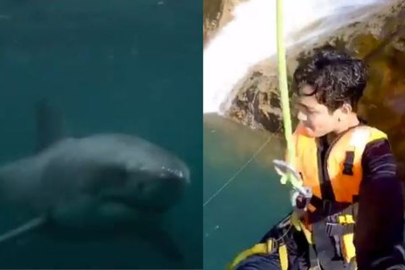 Lebih membingungkan, rakaman dari bawah permukaan air menampakkan seekor jerung sedang menghampiri remaja berusia 19 tahun itu.