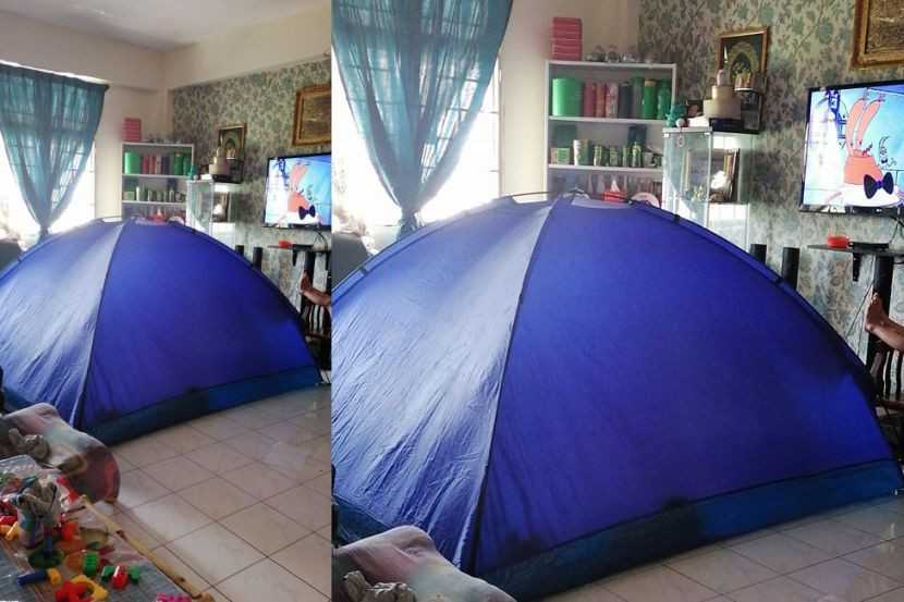 Sebuah keluarga terpaksa mengadakan pekhemahan di rumah kerana perlu menjalani kuarantin susulan suami kontak rapat kepada pesakit Covid-19. Foto FB Family Camping Malaysia