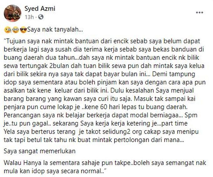 BUKAN mudah sebenarnya untuk seseorang yang bergelar bekas banduan bangkit meneruskan kehidupan. Golongan ini terpaksa menerima hakikat masih terdapat stigma dalam masyarakat terhadap mereka sehingga sukar mendapat peluang kedua. Tiada pilihan lain atau mungkin juga satu-satunya jalan penyelesaian yang ada, seorang bekas banduan memberanikan menghantar mesej kepada seorang aktivis sosial. ARTIKEL BERKAITAN: "Semua bulu menegak, meremang..." - Tandas tak ada pintu, jalan pun kena bongkok, aktivis terkesima lihat rumah orang miskin bersih gila! ARTIKEL BERKAITAN: Kereta bergerak guna 'tayar pinjam', wang bantuan guna beli bateri... rupa-rupanya kisah pasangan ini ada plot twist - "Kalau beli makanan akan habis juga" Menurut bekas banduan itu, dia mahu mendapatkan bantuan kerana masih belum mendapat sebarang pekerjaan selepas keluar dari penjara. Seorang bekas banduan mahu bangkit semula menjalani kehidupan baharu. --Gambar hiasan "Saya susah diterima kerja sebab saya bekas banduan, dibuang daerah dua tahun. Saya nak minta bantuan encik, bilik sewa tertunggak dua bulan dah. "Tuan bilik sewa pun dah minta saya keluar dari bilik sekiranya saya tak dapat bayar bulan ini. Demi tampung hidup saya sementara atau boleh pinjamkan saya dengan cara apa pun asalkan tak kena keluar dari bilik ini," kata pemuda itu menerusi petikan mesej yang dikongsikan oleh aktivis, Syed Azmi Alhabshi di halaman Facebook beliau. Bekas banduan itu juga menyuarakan hasratnya untuk mendapatkan modal berniaga, kerana kelulusannya setakat Sijil Pelajaran Malaysia (SPM). "SPM je, itu pun gagal. Sekarang saya kerja kerja katering secara sambilan. Yelah saya berterus-terang je takut selindung-selindung nanti orang cakap saya menipu. "Betul tak tahu nak minta pertolongan dari mana. Saya sangat memerlukan walaupun hanya sementara sahaja pun tak apa, boleh saya semangat nak mulakan hidup secara normal," ujarnya. Keadaan bilik yang disewa oleh bekas banduan tersebut. -foto Facebook Syed Azmi Bercakap kepada mStar, Syed Azmi mengulas lanjut mengenai bekas banduan dari Selangor berusia 28 tahun itu tanpa memperincikan latar belakang keluarga pemuda itu. Menurut beliau, pemuda tersebut didapati bersalah kerana menjual barang-barang yang dicuri rakannya dan ditahan selama kira-kira 60 hari. "Menerusi perkongsian tu, saya nyatakan tanggapan negatif segelintir masyarakat kita terhadap bekas banduan seperti penjenayah, mungkin sebab dadah, mak bapa tak tolong takkan kita nak tolong dia, nanti dia tipu dan guna duit yang dapat itu untuk bukan-bukan. "Tapi apa pula yang kita ada? Kita ada deria yang Allah bagi sebagai amanah untuk bantu orang lain. Cara dia mesej macam nak luahkan perasaan. "Dia tak beritahu pun berapa sewa bilik, dia tak cakap pun berapa bantuan dia nak. Masyarakat jangan ada stigma, dia mungkin tak akan berubah tapi kalau kita tak bantu dia, lagilah dia tak berubah," kata Syed Azmi. Mesej bekas banduan yang dikongsikan oleh Syed Azmi. Berkongsi kisah mengenai bekas banduan itu, Syed Azmi berkata, walaupun dalam kesulitan, pemuda tersebut masih mempunyai sikap yang baik untuk mendapatkan bantuan. "Bilik dia mungkin tak cantik, tapi teratur dan kemas. Pandai masak sebab ada dapur kecil di dalam bilik, tak ada pun sampah dan sisa makanan. Objektif utama saya membantu sesiapa pun dan membimbing mereka. SYED AZMI ALHABSHI "Saya nampak dia ada disiplin dan paling penting sikap dia yang penyabar, tak naik angin bila saya tanya macam-macam untuk kenal dia bagi mendapatkan pengesahan," ujarnya. Walaupun selama ini bantuan yang diberikan daripada pihaknya lebih tertumpu kepada kes berkeluarga, tapi masalah bekas banduan itu sebagai orang bujang turut diberikan perhatian. Keadaan bilik yang teratur dan kemas. -foto Facenook Syed Azmi "Objektif utama saya membantu sesiapa pun dan membimbing mereka. Duit atau bantuan itu sekadar medium untuk mereka bangkit membina semula kehidupan. “Seperti bekas banduan ni, dia tak senyap terus selepas dapat bantuan. Berkali-kali dia cakap terima kasih dan hargai atas bantuan diberikan, siap hantar voice note lagi. "Pernah ke saya gagalkan permohonan daripada orang yang meminta bantuan? Banyak juga, dan kebanyakannya pasal sikap. Sikap itu mencerminkan diri. Walaupun dia bekas banduan, dia ada attiude yang baik yang mungkin orang lain tak ada," kata Syed Azmi. Nak macam-macam info? Join grup Telegram mStar!