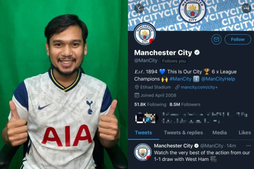 (kiri) Mohd Nazri menyarung jersi Tottenham. (kanan) Akaun rasmi Twitter Manchester City mengikuti akaun Twitter Mohd Nazri.