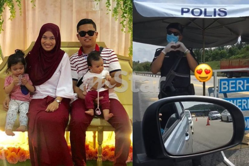 "Abang polis bagi 'heart' la kat kita hahaha. Macam ini la bila wife doktor, husband polis. Bertembung tepi jalan macam ini sajalah. Take care my husband. Jangan marah na, kita main phone sekejap je ni nak rakam. Jarang-jarang boleh rakam momen ni," demikian kapsyen pada perkongsian asal yang dimuat naik di Facebook wanita berkenaan.