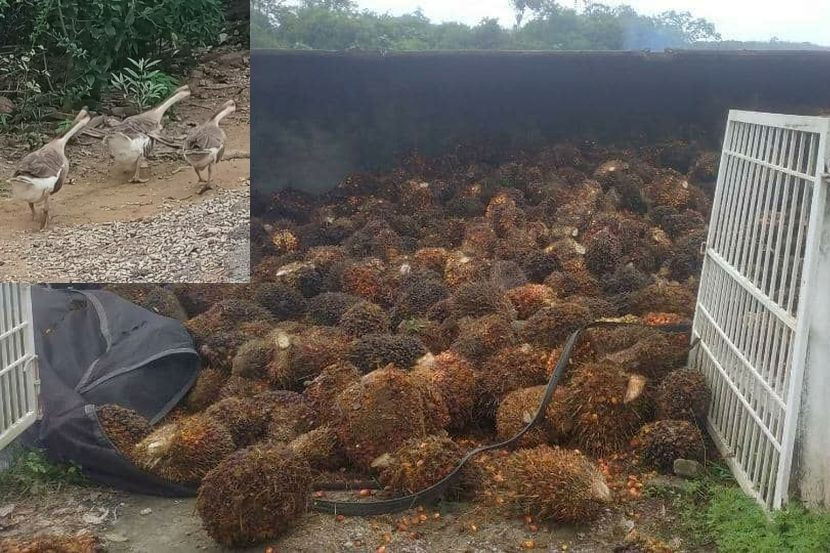 Keadaan lori yang membawa muatan kelapa sawit terbalik di hadapan pintu pagar rumah. (gambar kecil) Tiga angsa yang dibela keluarga Abdul Salam. -foto Abdul Salam