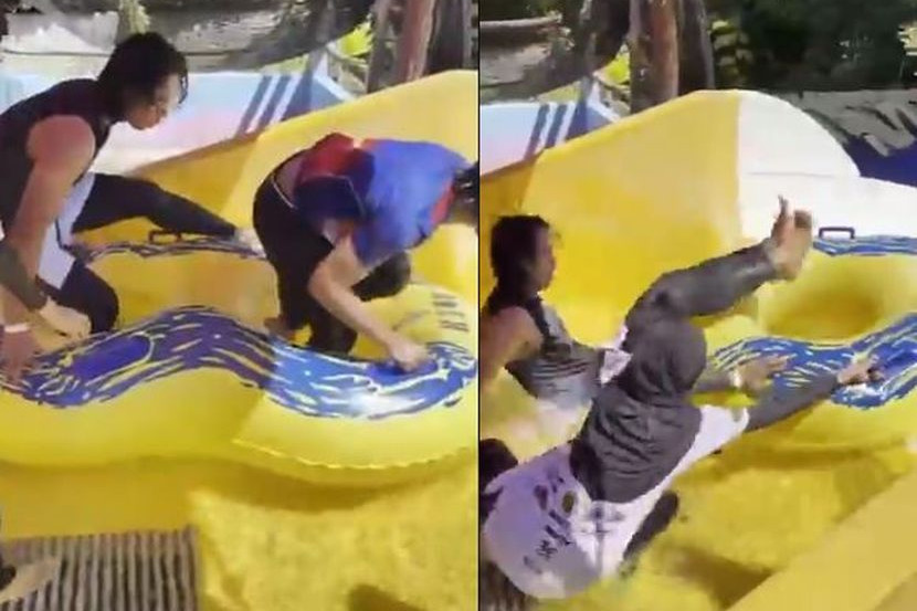 Dalam video yang dirakam pada Ahad lalu, dua rakan sedang bersedia untuk bermain permainan gelongsor air di sebuah taman tema di Pahang.