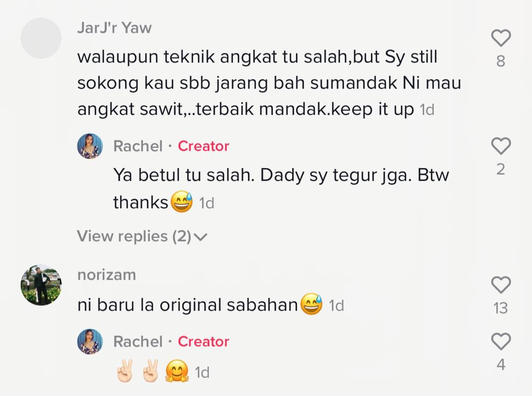 JANGAN kata lelaki sahaja boleh buat kerja perempuan, kerana dunia kini banyak yang telah berubah berbanding dulu. Tidak terkejut jika di tengah pandemik Covid-19 ini, ramai yang terpaksa melakukan kerja yang bukan dalam bidang mahupun sesuatu yang diminati. Remaja yang berusia 20 tahun ini membuktikan walaupun saiz badannya kecil, dia tetap mampu menolong ayahnya di ladang kelapa sawit. ARTIKEL BERKAITAN: Di sebalik kehebatan di kebun pisang, Instafamous kongsi detik cium tapak kaki ibu sebelum meninggal - “Wangi sangat, bau tak ada dalam dunia” ARTIKEL BERKAITAN: Bukan mesin rumput je! Turun bersawah, pasang siling pun gadis ni pernah buat... sakit badan ‘no hal’ - “Tak susah pun, cuma berat sikit” Bercerita kepada mStar, Ryecheal Saddy yang berasal dari Keningau, Sabah berkata, tidak ada yang mustahil, malahan semuanya terpulang kepada diri sendiri antara mahu atau tak nak lakukan sahaja. Tular satu video Ryecheal di TikTok apabila dia mengangkat tandan kelapa sawit dan memasukkannya ke kereta di ladang kelapa sawit Kampung Bingkor, Keningau. Video tular di laman TikTok Reychael. "Saya sudah biasa tolong ayah di ladang kelapa sawit, sejak sebelum saya belajar dulu pun. "Bagi saya tak ada yang mustahil, kalau saya boleh buat mesti wanita di luar sana pun boleh. "Video itu adik saya yang rakam masa kami tengah tolong ayah di ladang," katanya kepada mStar. Bagi saya hal hantaran mak ayah tentukan, bukan kerja saya. RYECHEAL Sehingga kini perkongsian itu telah mencecah 15,000 likes dan 8,000 komen. Ryecheal yang baru sahaja menamatkan pengajian di Selangor dalam pengurusan Kru Kabin berkata, biarlah dia mengisi masa terluang dengan membantu ayahnya walaupun ramai yang menganggap kerja di ladang itu tidak sesuai untuk kaum hawa. "Saya baru sahaja habis belajar, belum sempat nak bekerja pun, malahan bidang yang saya pelajari paling terkesan dengan pandemik Covid-19. Sebab itu saya fikir ada baiknya saya tolong ayah dahulu buat masa ini. Reychael berharap dia dapat menjadi contoh terbaik kepada mereka yang tidak berani mencuba sesuatu yang baharu. "Secara peribadi, kerja saya ini memang lah kerja lelaki tetapi saya dah terbiasa dari kecik, jadi saya tak kisah sangat. "Saya tahu ramai yang kata kerja ini tidak sesuai dengan perempuan kerana mengangkat benda berat tetapi selagi saya mampu dan tidak memudaratkan diri apa salahnya," jelasnya. Sementara itu, ada yang lebih mencuri perhatian netizen apabila Reycheal sempat bergurau di ruangan komen mengenai hantaran tinggi kerana mampu melakukan kerja yang lebih sinonim dengan lelaki. "Niat saya cuma nak gurau-gurau sahaja kerana banyak pula komen dan DM yang saya terima setiap hari selepas video itu viral. Komen netizen yang menegur Reychael salah mengangkat kelapa sawit itu "Bagi saya hal hantaran mak ayah tentukan, bukan kerja saya," ujarnya berseloroh. Reychael berharap dia dapat menjadi contoh terbaik kepada mereka yang tidak berani mencuba sesuatu yang baharu. Katanya, dalam situasi yang serba mencabar ini, kita harus beranikan diri untuk mencuba bukannya duduk di rumah dan hanya berharap semuanya akan berakhir dengan cepat. Nak macam-macam info? Join grup Telegram mStar!