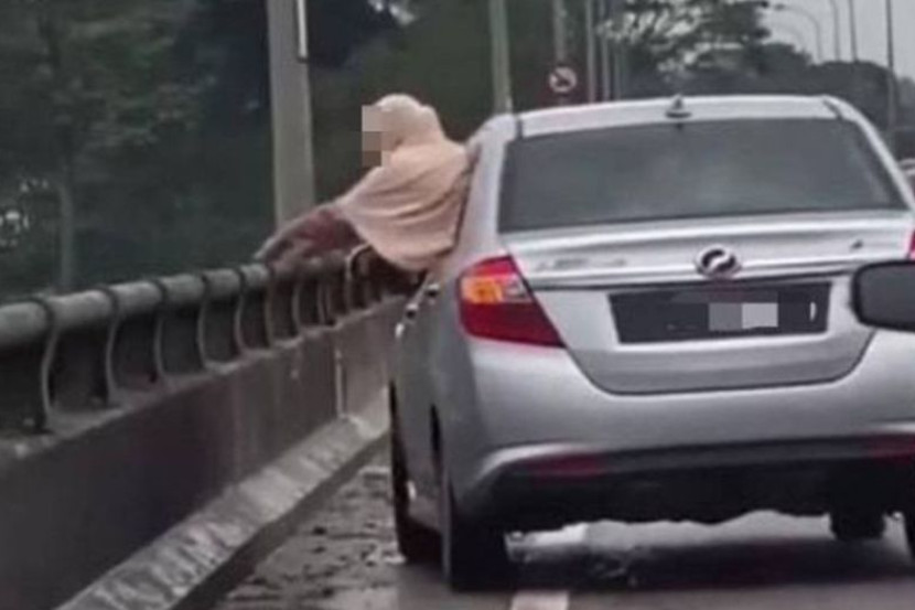 Tangkap layar daripada rakaman yang tular memperlihatkan seorang wanita membuang bungkusan daripada kenderaannya.