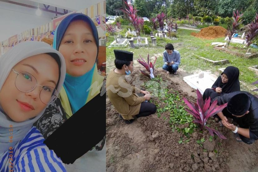 (gambar kiri) Nalissa (kiri) bersama ibu. (gambar kanan) Nalissa (dua, kanan) bersama sebahagian keluarga di pusara ibu.