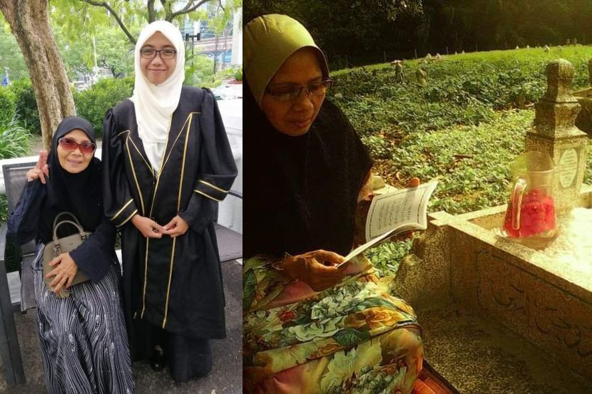(gambar kiri) Sharifah (kanan) ketika bergelar peguam bersama ibu. (gambar kanan) Ibu Sharifah di pusara bapanya.