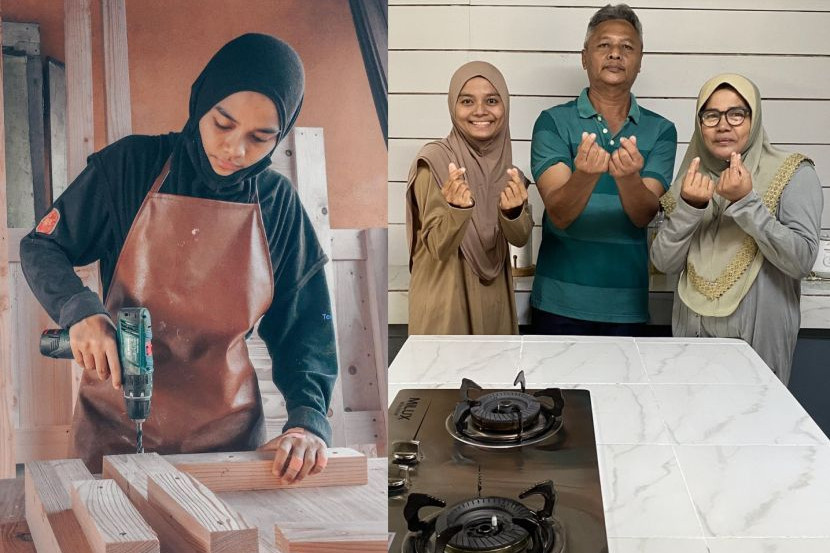 Wani, seorang ustazah yang turut bekerja sebagai tukang kayu bergambar dengan kedua ibu bapanya di dapur baharu kediaman mereka.