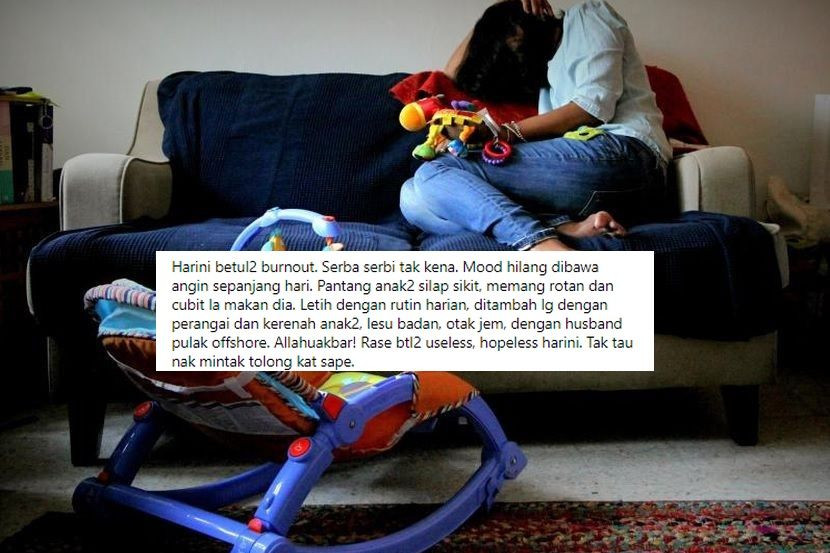 "Hari ini betul-betul burnout. Serba-serbi tak kena. Mood hilang dibawa angin sepanjang hari. Pantang anak-anak silap sikit, memang rotan dan cubit la makan dia.