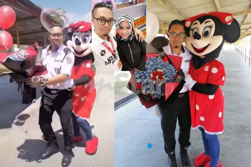 Menerusi video yang tular di media sosial, lelaki itu menerima hadiah jambangan bunga duit dan belon, selain maskot watak kartun popular Minnie Mouse dilihat memeriahkan suasana.
