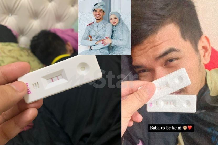 Azmina yang mengejutkan suaminya bangun dari tidur, menunjukkan kit ujian kehamilan dengan keputusan positif. Azmina dan suami (gambar kecil) baru berkahwin Oktober lalu.