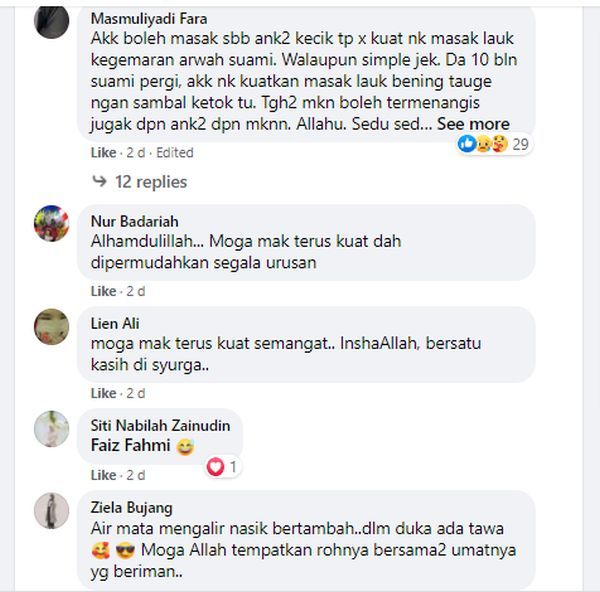 "Kasih sayang suami isteri memang ke syurga Ilahi. Sebak balik kerja ada lauk kari ayam... rindu terubat nak makan mak masak. Mak cakap 'mak masak dik'. Air mata mengalir, nasi bertambah," demikian tulis pelayar itu dalam perkongsian di laman Facebook Masak Apa Tak Jadi Hari Ni.