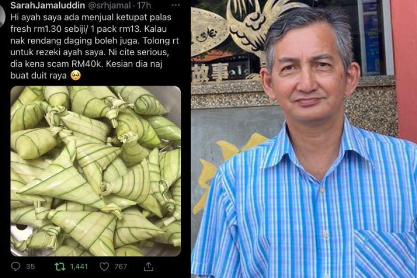 Anak bongsu warga emas itu, Siti Sarah Asiah, 28, memuat naik status di Twitter yang mana bapanya terpaksa menjual ketupat palas untuk mengumpul semula wang yang telah lesap itu.