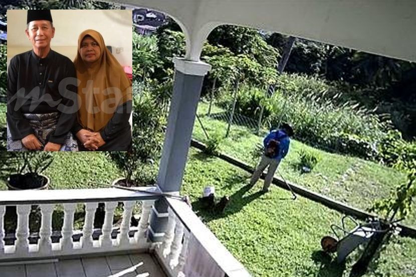 Saffuan memantau rakaman CCTV di rumah yang menyaksikan bapanya sedang memotong rumput di halaman. Foto kecil menunjukkan Ibu bapa Saffuan yang menetap di Ipoh.