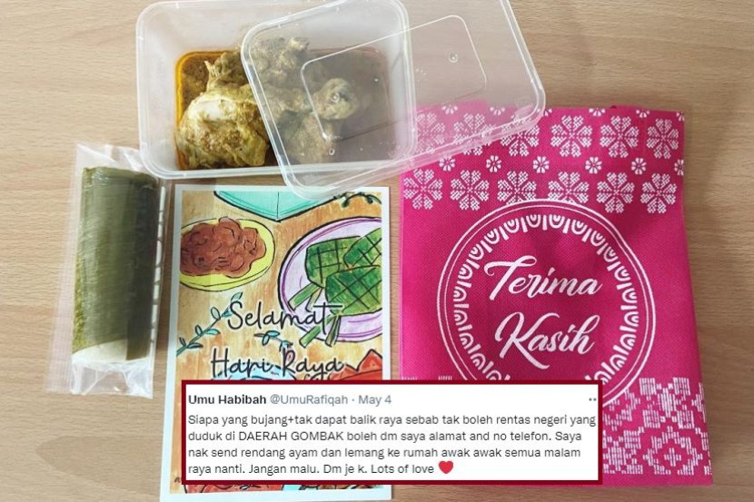 Projek rendang dan lemang yang diilhamkan wanita bernama Rafiqah Umu Habibah ini tular di Twitter minggu lalu apabila ramai yang memujinya memberi juadah itu secara percuma kepada individu bujang yang beraya berseorangan kerana tidak dibenarkan rentas negeri.