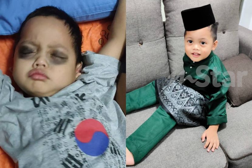 Foto kiri menunjukkan mata anak Siti dihitamkan menggunakan pembayang kata, dan foto kanan anaknya yang lasak.