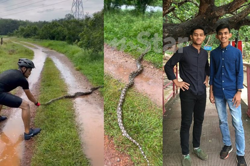 Foto kiri tangkap layar video seorang pemuda menarik seekor ular sawa. Foto kanan Aizzat (kanan) dan rakannya, Alif berkongsi pengalaman.