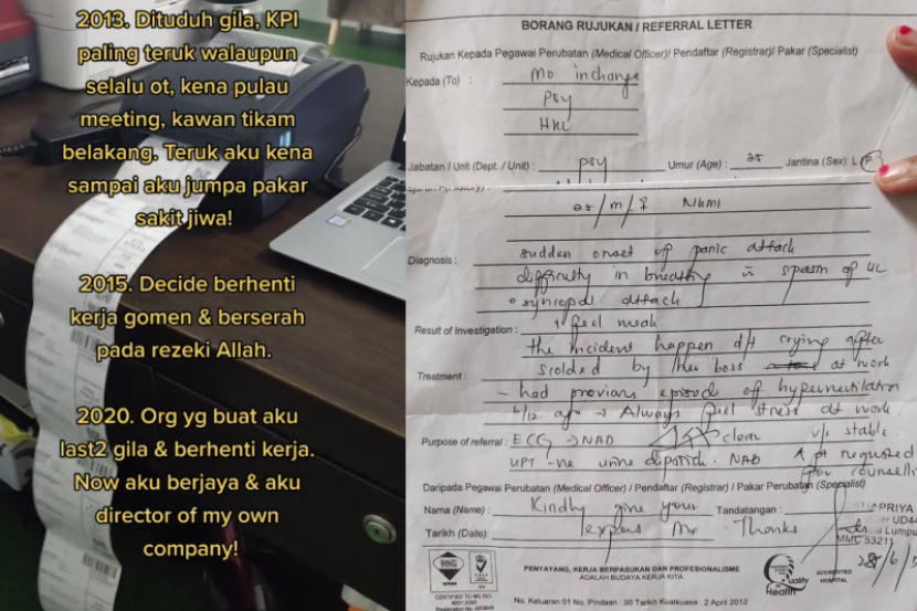 PERNAH digelar gila, wanita ini membuktikan bahawa dia mampu untuk bangkit dari segala dugaan yang dilalui. Menerusi rakaman yang dimuat naik olehnya, dia mengimbas kembali kisah duka sewaktu bekerja di tempat kerja lamanya. Perkongsian tersebut meraih hampir 50,000 tontonan di aplikasi TikTok. ARTIKEL BERKAITAN: Wanita ini gelak sakan tunangnya menangis suntik vaksin, mengadu ‘belum cucuk dah rasa sakit’... pernah juga ‘buat hal’ masa nak cabut gigi ARTIKEL BERKAITAN: Lelaki ini lawat rakan bergelut sara keluarga! Beli rumah harga RM100, cari rezeki guna perahu pinjam - “Telefon dah jual nak beli barang dapur” Bercerita kepada mStar, Norhasimah Muchtar, 32, berkata, peristiwa itu berlaku sewaktu dia bekerja di sebuah syarikat pada tahun 2013. Sepanjang bekerja di situ dia mendakwa mendapat layanan yang buruk selain perlu berada di dalam persekitaran pejabat yang dianggapnya sebagai toksik. View this post on Instagram A post shared by mStar (@mstaronlineofficial) "Kisah di sebalik video itu menerangkan tentang pengalaman saya semasa bekerja di bahagian pelaburan selama lebih kurang dua tahun. "Sepanjang bekerja saya mendapat layanan buruk dan dilemparkan dengan kata-kata kesat yang tak sepatutnya," dakwanya. Mesra disapa Hasimah, dia mendakwa turut dianiaya oleh rakan sekerjanya sendiri sehingga dipanggil oleh pihak syarikat dan dimarahi sehingga dia pengsan. "Belum sempat saya mempertahankan diri, saya dimaki di hadapan pekerja lain sehingga menyebabkan saya pengsan. Maka bermulalah detik hitam apabila saya dikejarkan ke Hospital Kuala Lumpur (HKL) sebagai pesakit psikitari. Surat yang dikeluarkan oleh pihak HKL selepas Hasimah dikejarkan ke hospital akibat pengsan di pejabat. "Pihak HKL ada memberikan referral letter untuk saya bercuti dan pulang ke kampung bagi menenangkan fikiran. Membaca surat itu, ada yang menggelarkan saya 'gila' di pejabat," katanya yang berasal dari Pasir Gudang, Johor. Setelah melalui pelbagai dugaan di syarikat tersebut, anak kedua daripada empat beradik itu mengambil keputusan untuk berhenti kerja dan memulakan karier baharu dia sebuah syarikat swasta di Johor Bahru pada tahun 2015. Hasimah mendirikan rumah tangga pada tahun yang sama dengan, Mohamad Iskandar Maamin, 32, dan berhenti kerja sekali lagi pada tahun 2019 sebagai persediaan menimang cahaya mata. "Saya terpaksa berhenti sebab peluang ini amat saya nanti-nantikan kerana saya menjalani rawatan kesuburan di hospital swasta untuk hamil. "Sebelum ini saya ada buat bisnes part time seperti menjual barangan bayi dan kek tetapi beralih kepada perniagaan sabun kerana ia merupakan barang keperluan. Buat sesuatu yang kamu minat dan yang penting berdoa pada Allah untuk berikan kekuatan. NORHASIMAH MUCHTAR "Saya bermula dari rumah dan mendapat tempahan pelanggan sehingga berjaya membuka kedai sendiri serta menghasilkan sabun muka serta sabun cecair. Suami banyak memberi dorongan dari segi modal dan teknikal sehingga saya berjaya," ujarnya. Ibu kepada seorang cahaya mata itu berpesan kepada orang ramai supaya tidak malu untuk mendapatkan bantuan daripada pakar sekiranya mempunyai masalah tekanan kerana ia sebenarnya sangat membantu. Tambahnya lagi, setiap individu harus bergaul dengan golongan yang berfikiran positif dan sentiasa berdoa kepada Allah untuk diberikan kekuatan dalam menjalani kehidupan. "Bagi yang mengalami situasi sama, saya nasihatkan jangan malu untuk berjumpa pakar psikiatri dan abaikan mereka yang menggelarkan kamu gila hanya kerana kamu memerlukan rawatan. "Tanpa dorongan pakar psikiatri, orang yang mengalami tekanan perasaan ini tidak dapat menilai mana yang baik dan buruk kerana tiada bimbingan yang betul. Suaminya banyak membantu dari segi modal dan memberi dorongan sepanjang mengendalikan bisnes menjual sabun. "Cuba keluar dari persekitaran toksik tersebut dan bergaul dengan kawan-kawan yang positif. Buat sesuatu yang kamu minat dan yang penting berdoa pada Allah untuk berikan kekuatan. "Jangan membalas mereka yang membuat kita dan abaikan semuanya. InshaAllah, jika anda berada di pihak yang benar, Allah yang akan membalas perbuatan mereka," katanya. Dapatkan info dengan mudah dan pantas! Join grup Telegram mStar DI SINI TONTON VIDEO PILIHAN!
