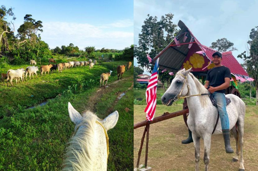 "Dulu jalan kaki atau menunggang motor sambil pegang kayu. Sekarang ni saya tunggang kuda saja, lembu-lembu ni lebih ‘mendengar kata’ dalam masa 10 minit je," katanya sambil menambah setakat ini mereka menternak kira-kira 70 ekor lembu, 30 ekor kambing dan 20 ekor kerbau.