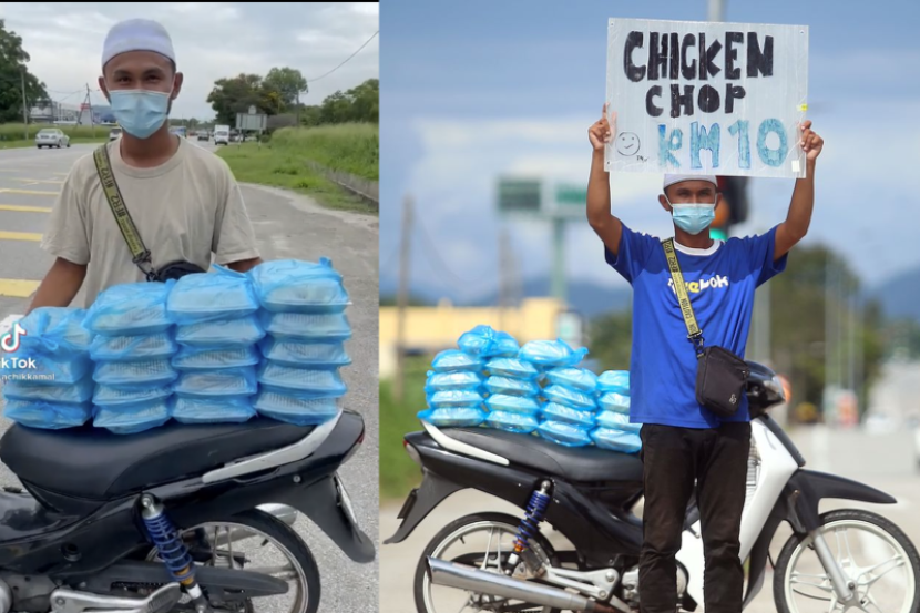 Pemuda berkenaan berkongsi video memaparkan dia sedang memegang papan tanda yang tertulis 'Chicken Chop RM10' di tepi jalan.